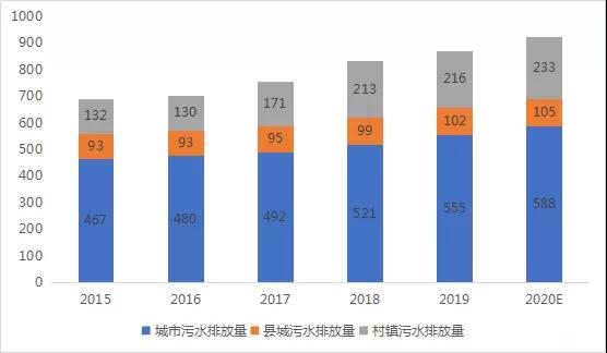 污水排放量持續(xù)上升,污水處理能力亟待增強。除了供水外,污水處理也是目前水務行業(yè)重點關注的領域之一。從污水處理的供給來看,由于城鎮(zhèn)化和經(jīng)濟發(fā)展需求,我國城市近年來污水產(chǎn)生量和處理量呈上升趨勢。截至2019年底,全國城市污水排放量為555億噸,縣城污水排放量為102億噸,村鎮(zhèn)污水排放量為216億噸,合計873億噸。據(jù)預測,我國2020年城市污水排放量為588億噸,縣城污水排放量為105億噸,村鎮(zhèn)污水排放量為233億噸,合計926億噸。我國城鎮(zhèn)污水處理能力亟待增強。