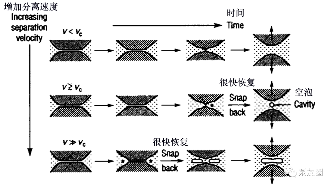 剛剛描述的過程表明,在足夠高的分離速度下,兩個接觸表面沒有足夠的時間從它們最初的彎曲或扁平狀態(tài)彈性釋放——即使它們沒有接觸而是被非常薄的液體膜隔開。因此,在距中心有限的徑向距離處達到最大負壓,并且在此處,表面突然反彈(反沖),形成空泡(但不一定破裂),并發(fā)生損壞。