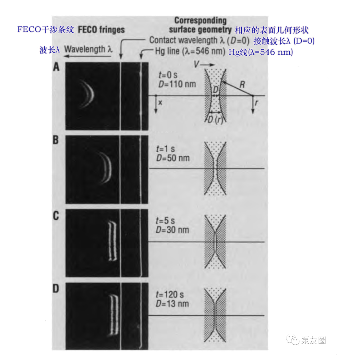 圖1顯示了 pbd 中粘度為 180 p的兩個接近表面的 feco 條紋圖案隨時間變化。最初(圖 1a)表面以穩(wěn)定的速度 v 相互接近但不變形。當表面相距約 50 nm 時(圖 1b),由于支撐材料的扁平化和壓縮,它們開始相對于彼此減速。